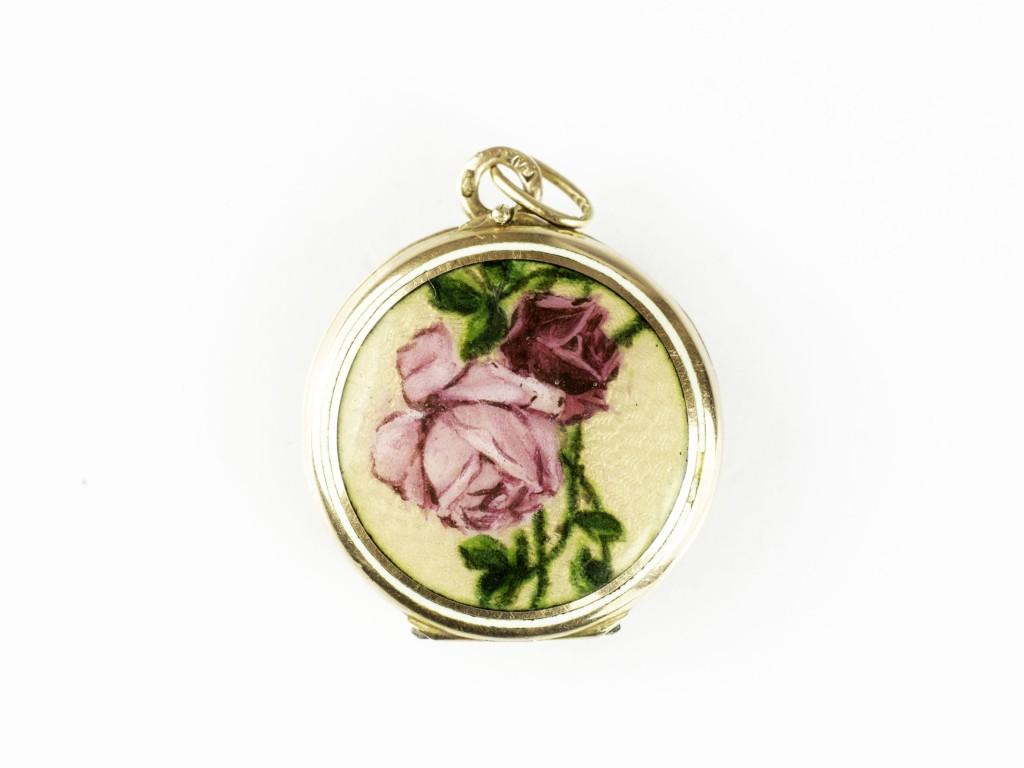Zlatý medailonek o ryzosti 583/1000, punc liška, váha 5,83g, na výšku celkem i s očkem 32 mm, na šířku 24 mm.