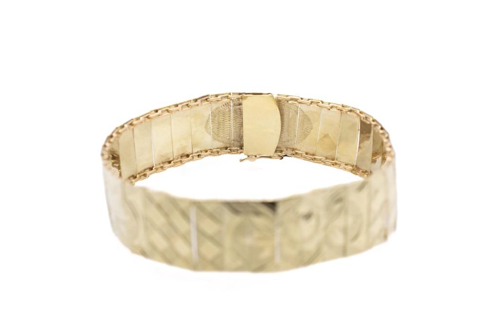 Zlatý náramek, ryzost 585/1000, punc labuť, váha 14,09 g, délka včetně zapínání 18,5 cm.
