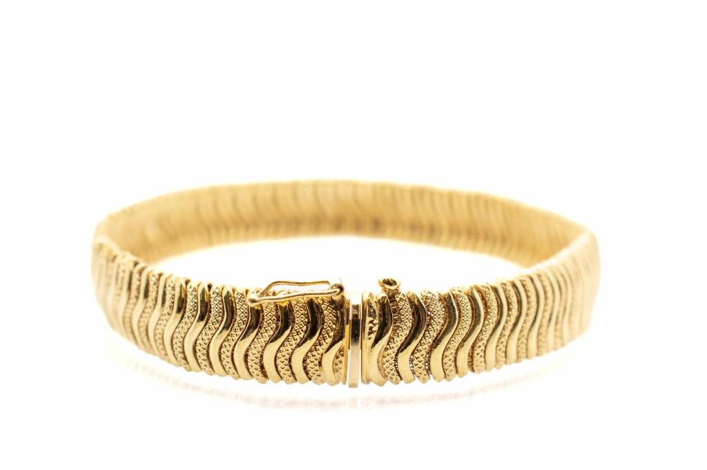 Zlatý náramek, váha 14,24 g, délka včetně zapínání 20,2 cm, šířka 1 cm, punc labuť, ryzost 585/1000.