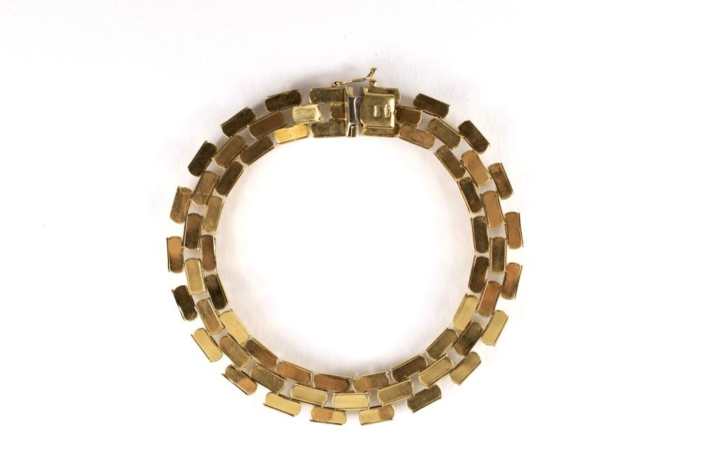Zlatý náramek, ryzost 750/1000, punc kohout, váha 26,26 g, délka včetně zapínání 22 cm, šířka 11 mm.