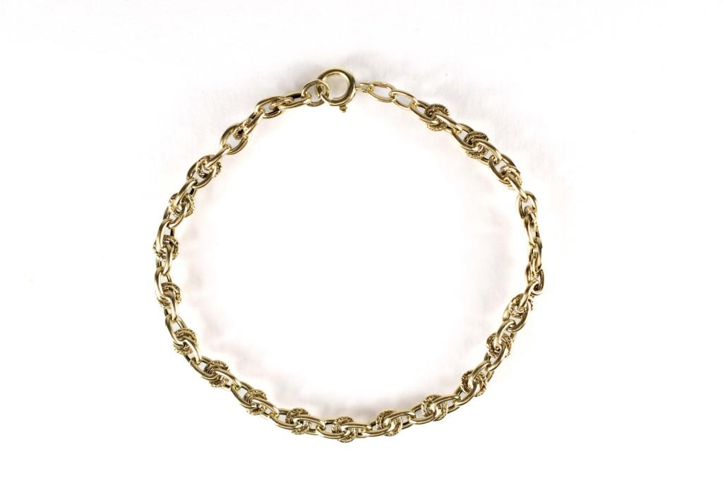 Zlatý náramek o ryzosti 585/1000, punc lyra. Váha 4,67 g, délka i se zapínáním 19 cm.