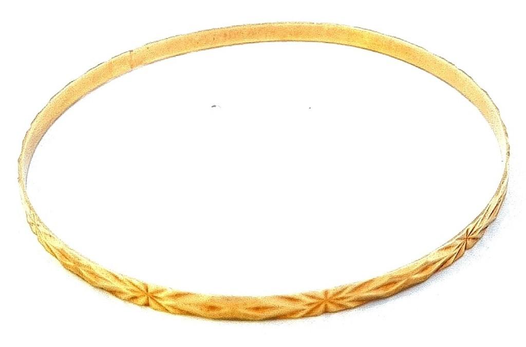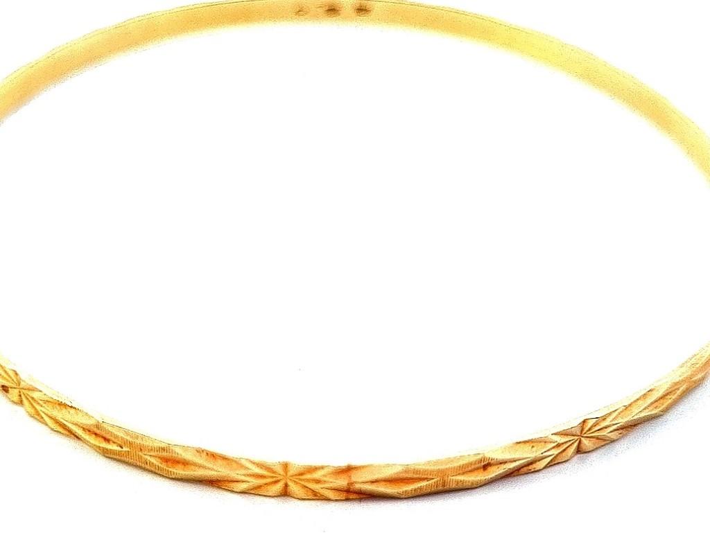 Zlatý náramek o ryzosti 585/1000, punc čejka. Váha 7,58 g, šířka 3,5 mm, vnitřní průměr 6,8 cm.