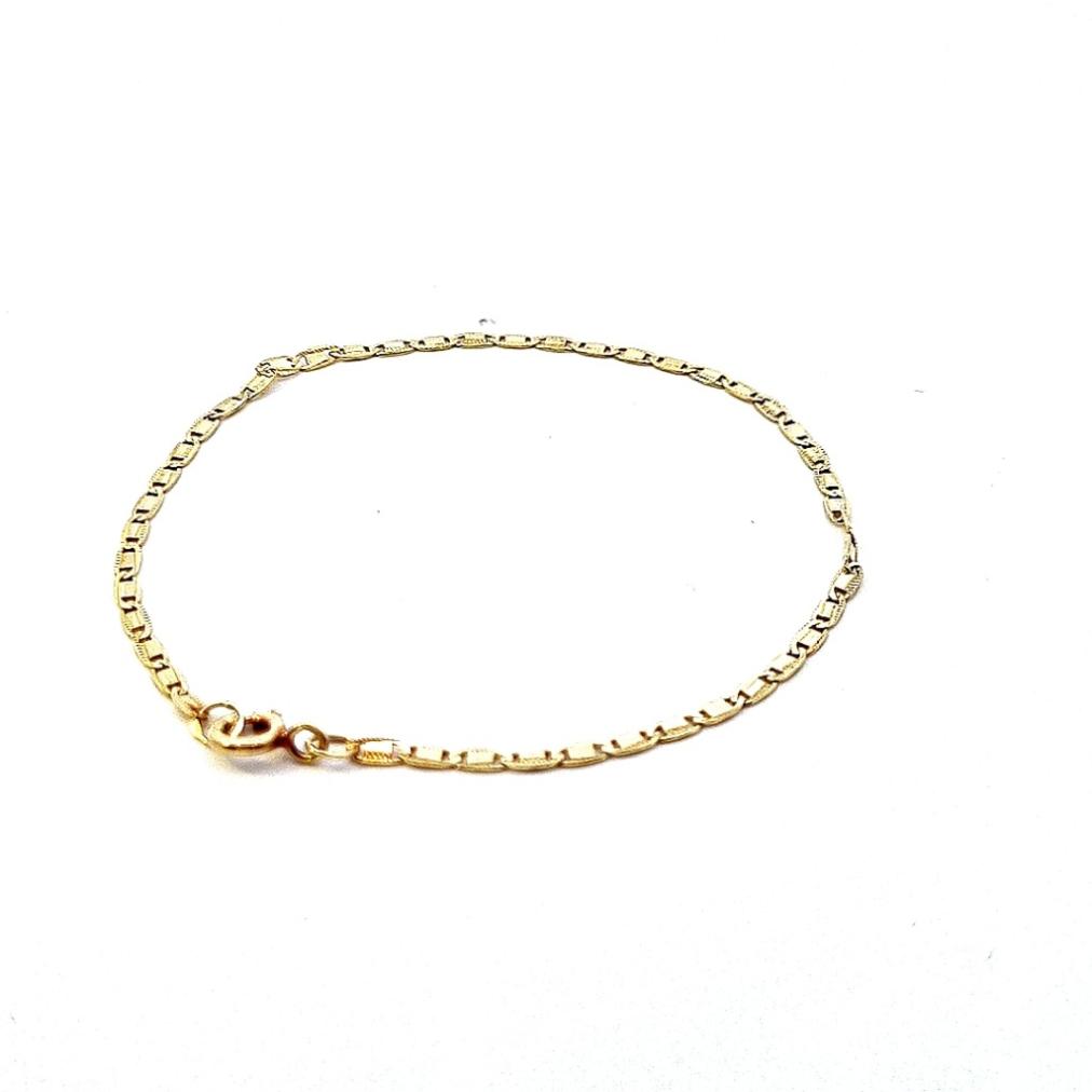 Zlatý náramek o ryzosti 585/1000, punc labuť. Váha 1,66 g, délka 18,5 cm, šířka 3 mm.