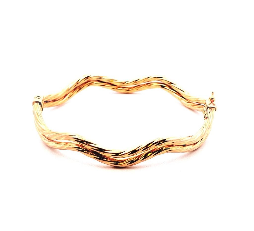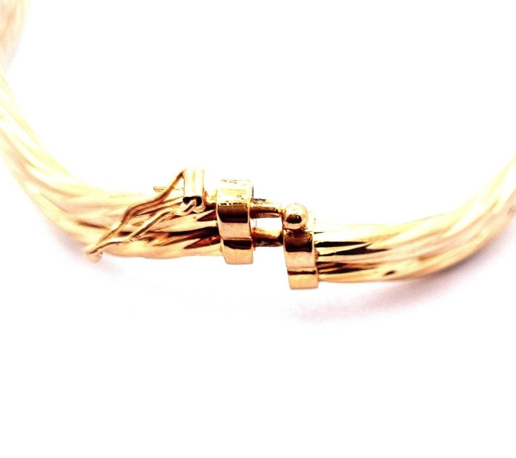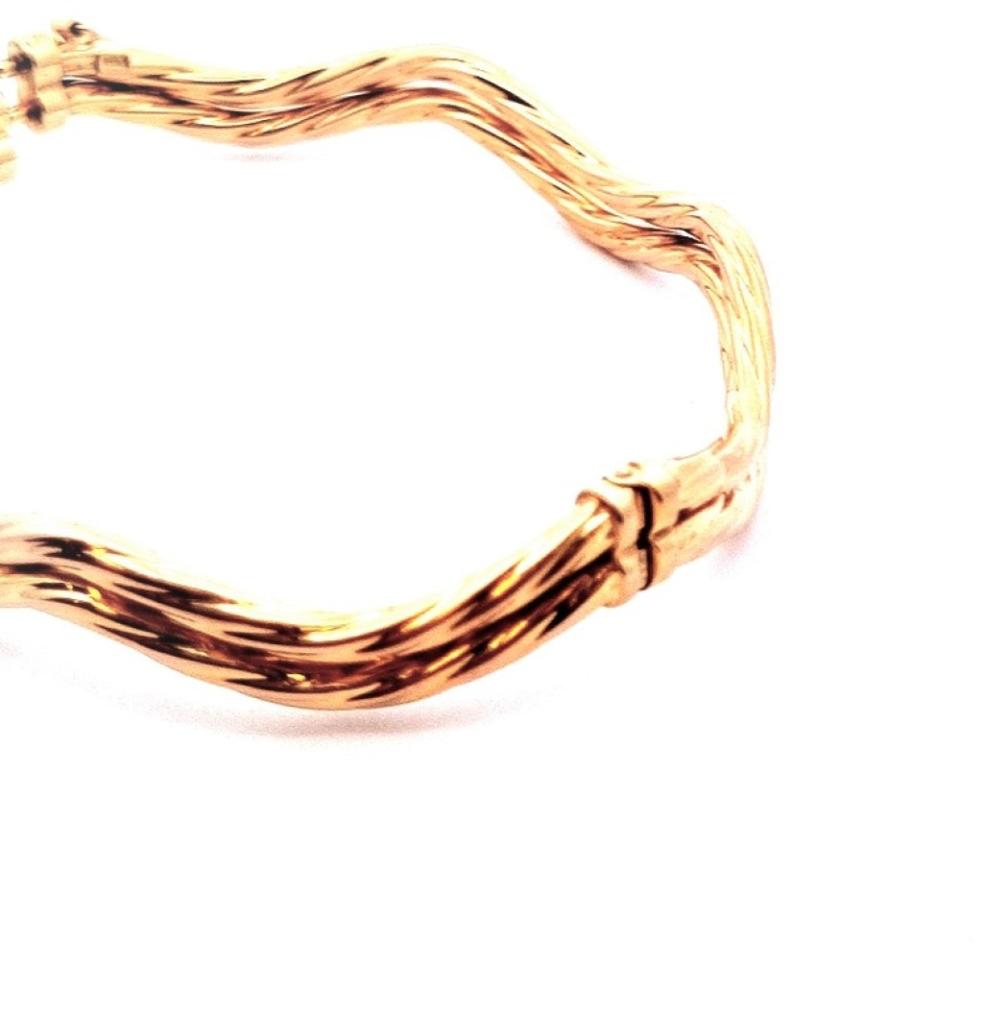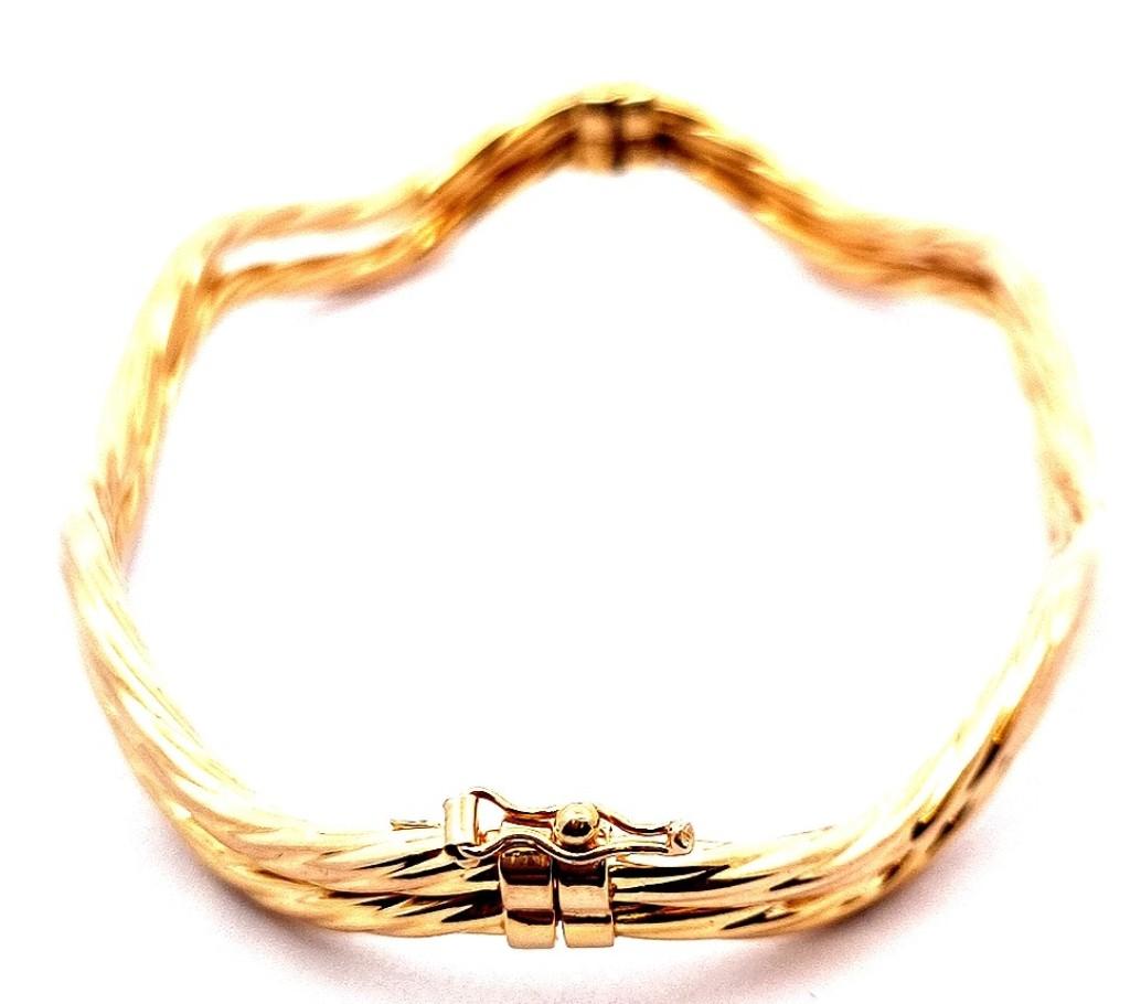 Zlatý náramek o ryzosti 375/1000, punc Z a slunce, váha 7,23 g, v nejširším bodě 7 mm, vnitřní průměr 62 mm.