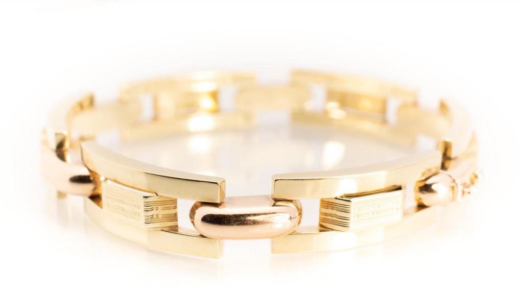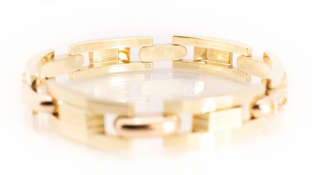 Zlatý náramek o ryzosti 585/1000, punc čejka, váha 22,28g, délka , v nejširším bodě 10 mm. délka náramku 20 cm.