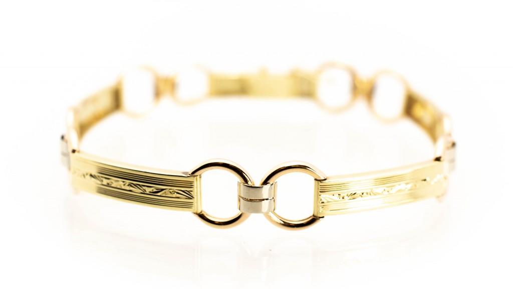 Zlatý náramek o ryzosti 585/1000, punc lvíček, váha 8,45 g , v nejširším bodě 10 mm. délka náramku po zacvaknutí 19 cm.