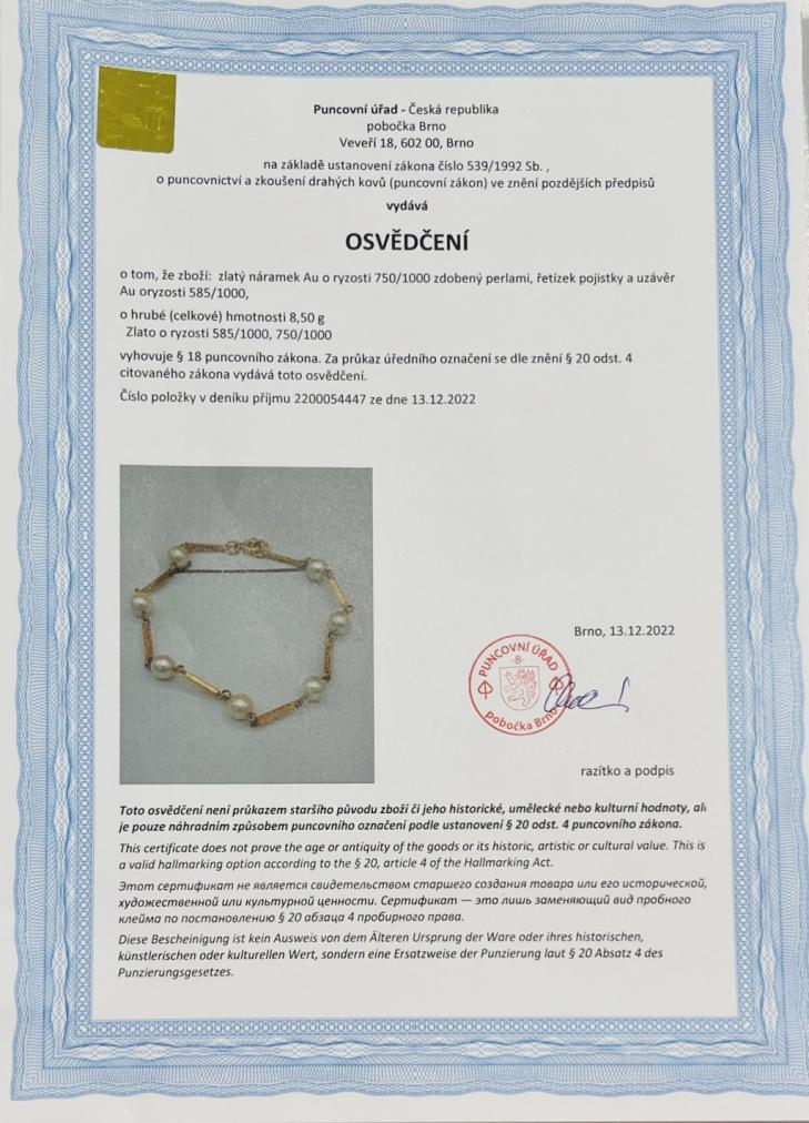 Zlatý náramek o ryzosti 750/1000, řetízek pojistky a uzávěr o ryzosti 585/1000, k dispozici osvědčení z puncovního úřadu, váha 8,50g, délka 19 cm, průměr perly 7 mm.