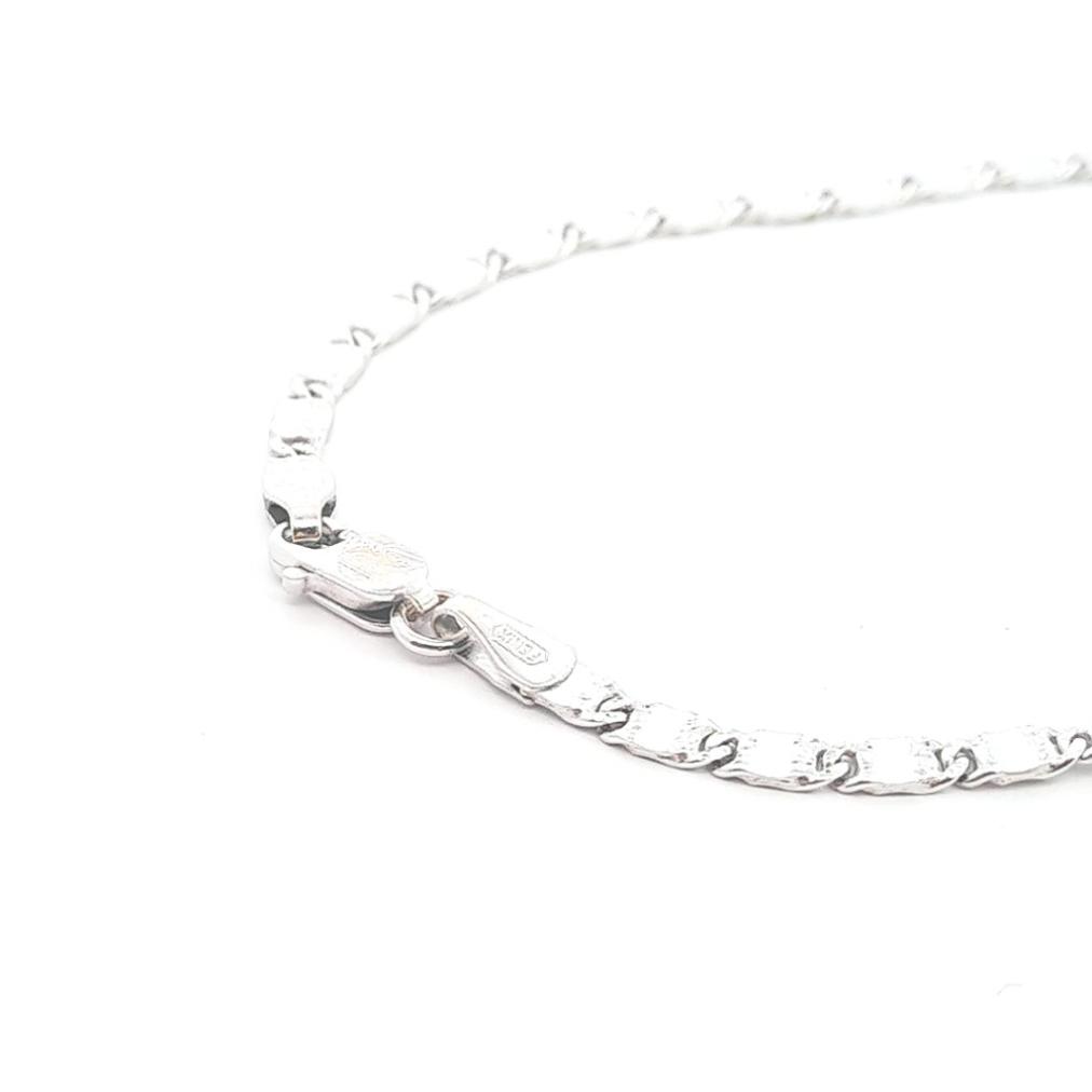 Zlatý náramek z bílého zlata o ryzosti 585/1000, punc labuť. Váha 2,94 g, délka 18 cm, šířka 2,5 mm.