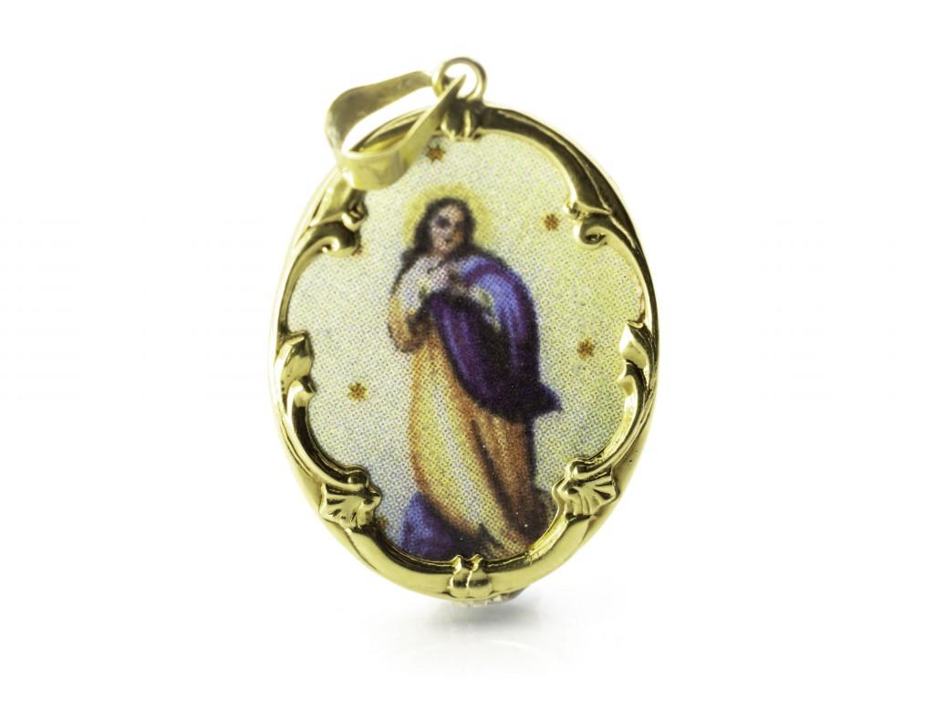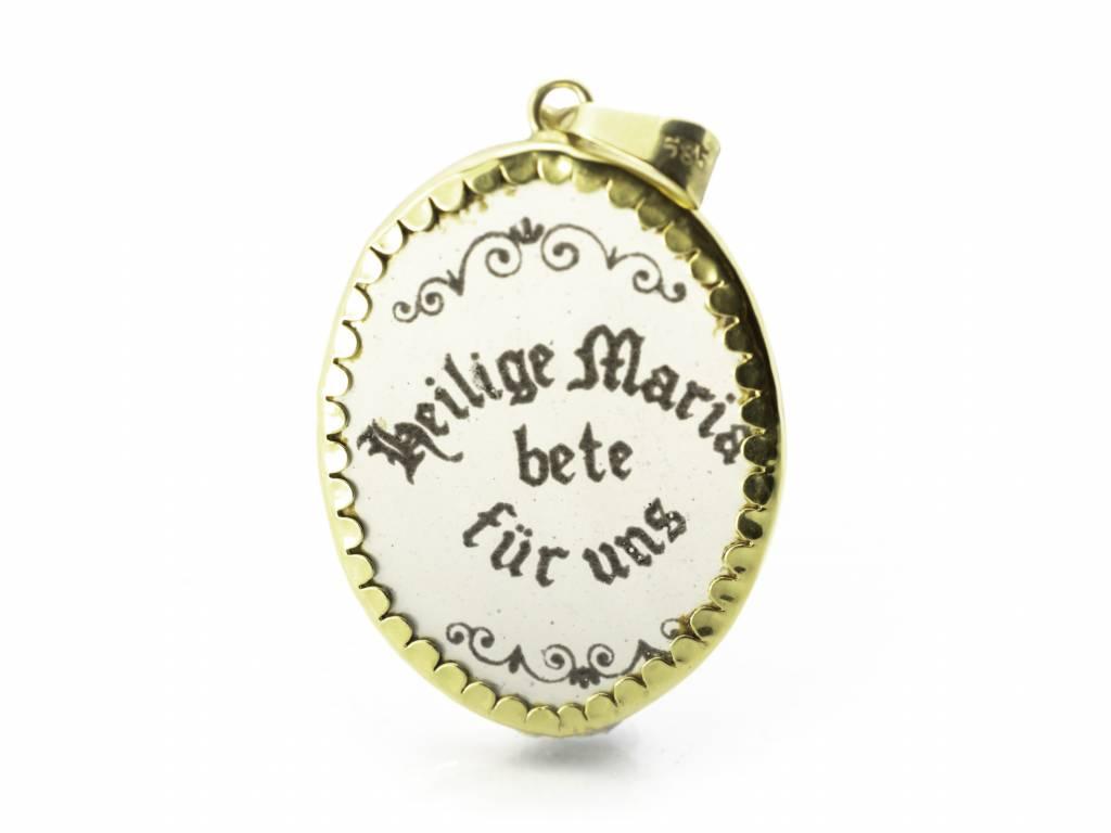 Zlatý přívěšek o ryzosti 585/1000, váha celkem 3,88 g, punc labuť, na výšku bez ouška 27 mm, madonka na porcelánu.