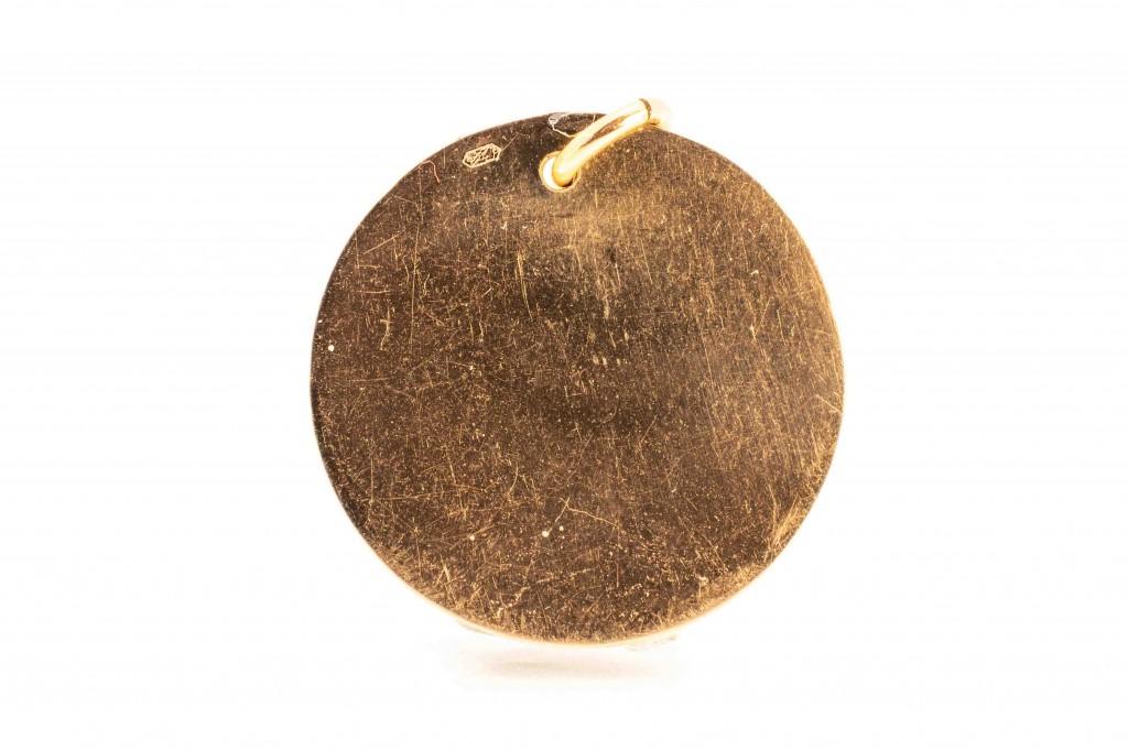 Zlatý přívěsek o ryzosti 585/1000, punc labuť, váha 1,98g, výška celkem i s očkem 23 mm.