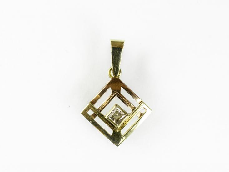 Zlatý přívěšek o ryzosti 585/1000, punc labuť, váha 0,88g, na výšku i s očkem 22 mm, na šířku v nejširším bodě 14 mm.