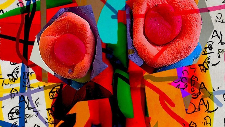 Figurace a znak: Často pracuje s redukovanou figurací – obličeje, lebky, siluety – které jsou převedeny do zjednodušených, téměř ikonických znaků. Tyto figury působí archaicky a zároveň silně moderním dojmem.